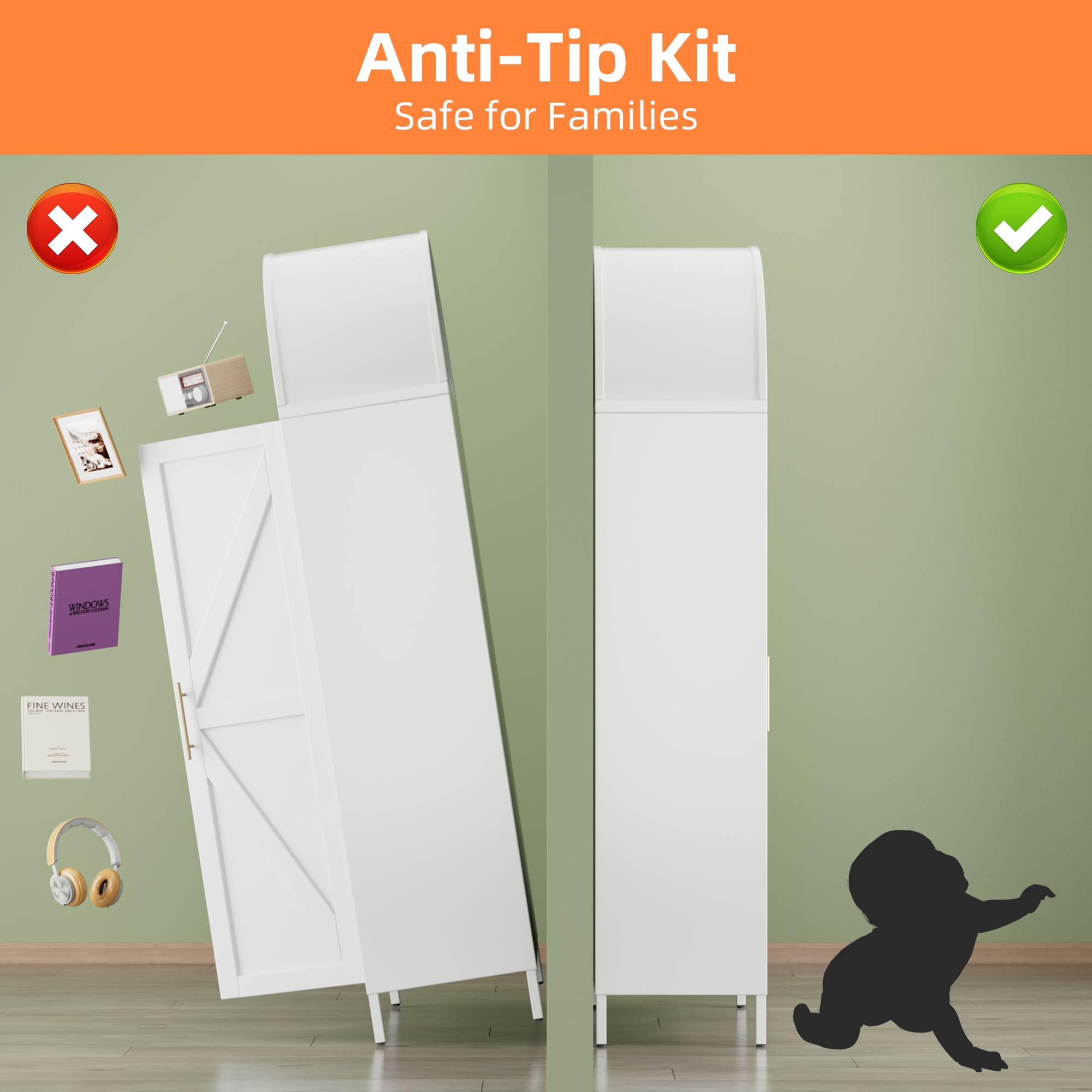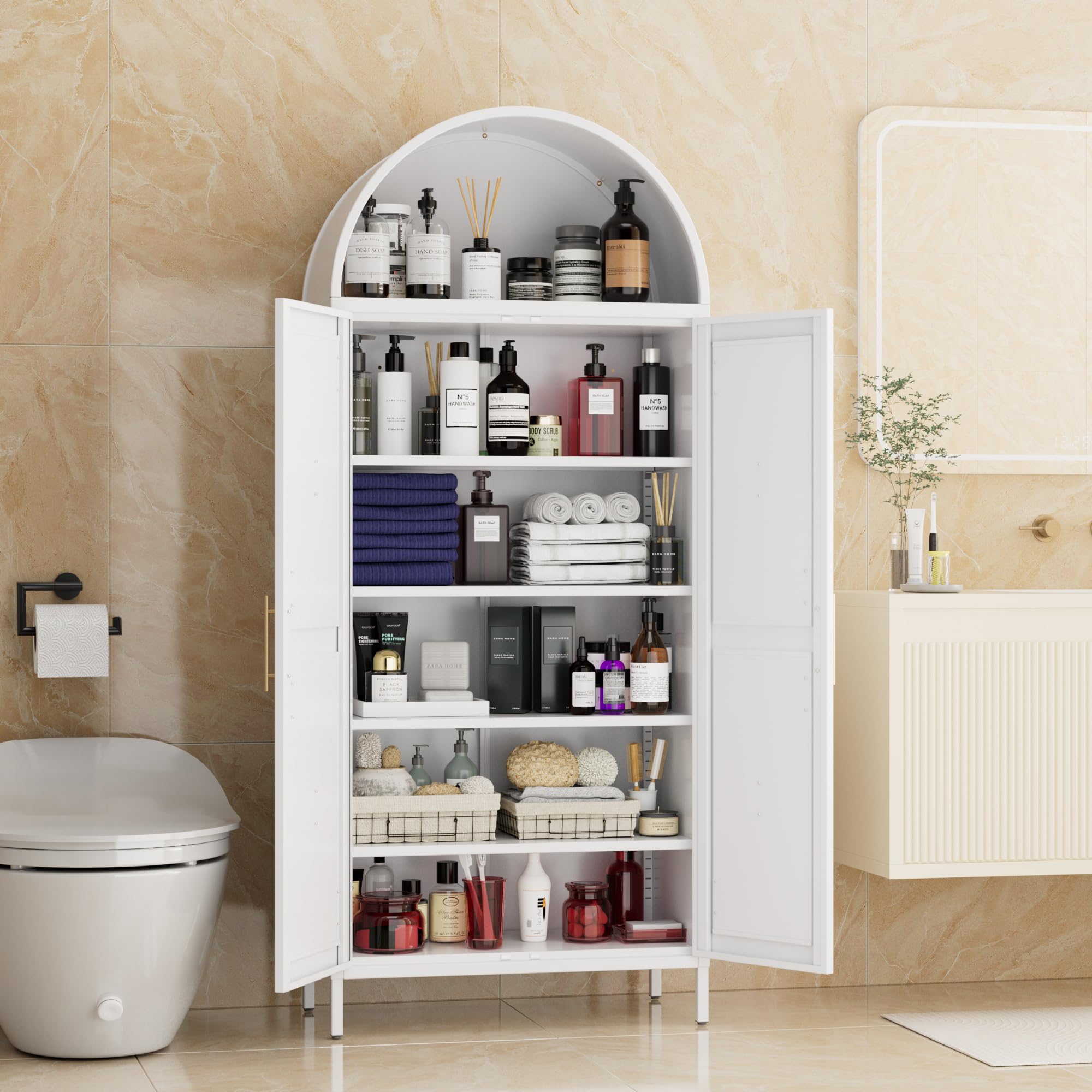 • Upgraded Arch Cabinet Design: Arched pantry cabinet features an arched design with golden handles, presenting an elegant and classic look. On the arched kitchen pantry cabinet, a strong adhesive Magnetic closure has also been added to ensure smooth and safe door closure. Sufficient space is suitable for various places such as kitchens, living rooms.