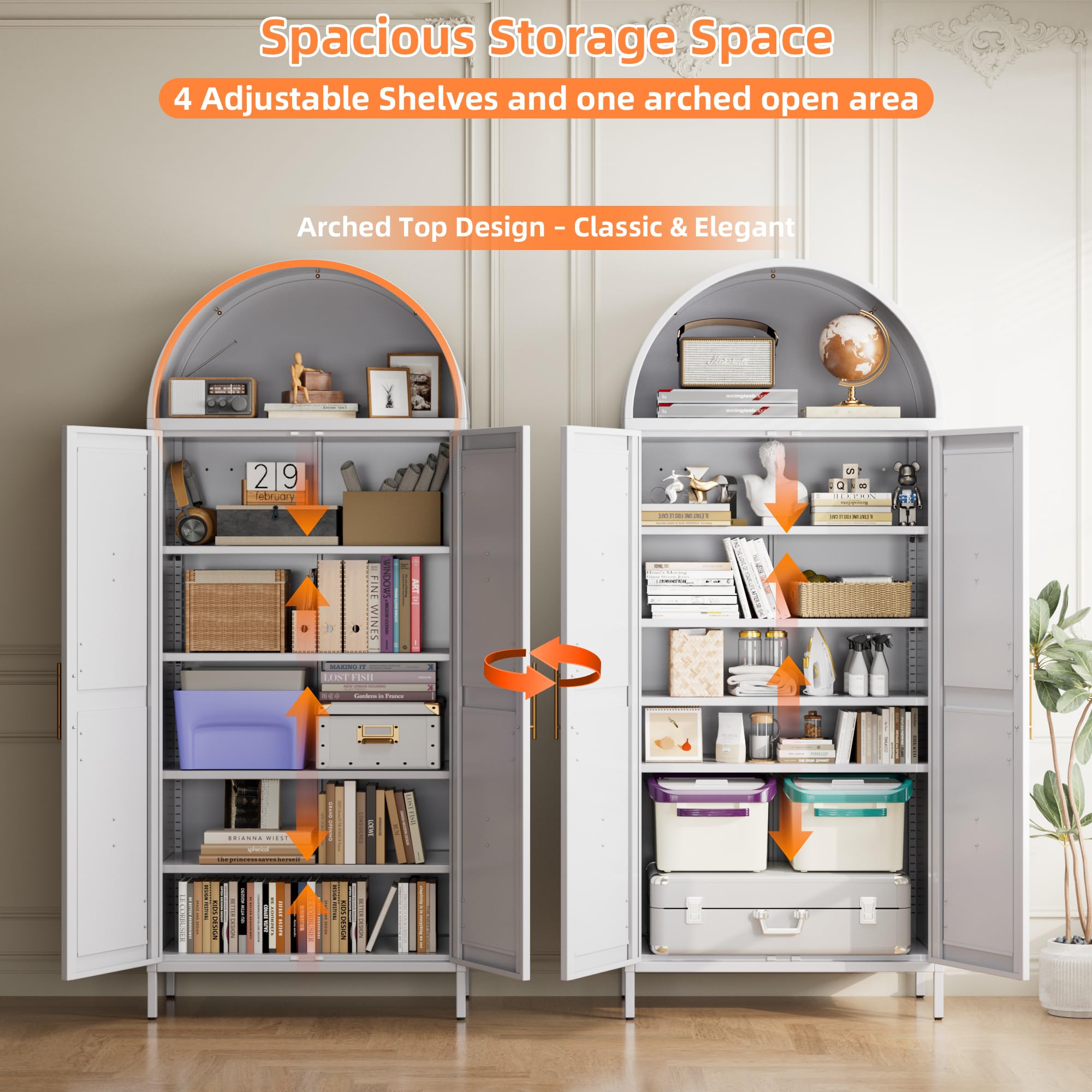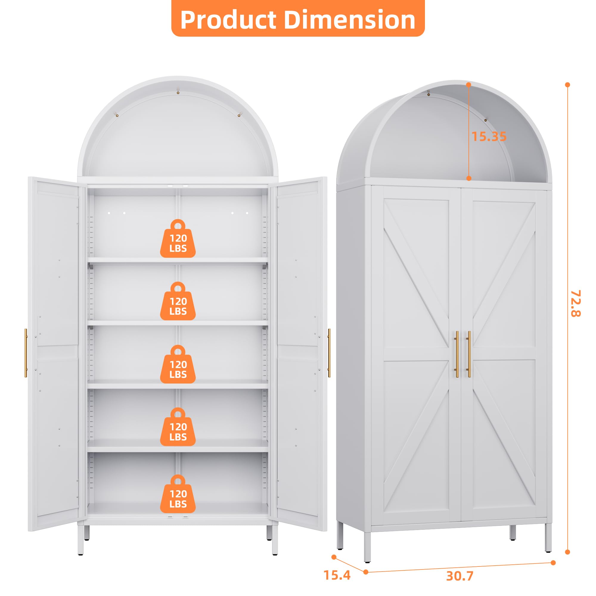 • Adjustable Shelves: There are 4 adjustable shelves in the tall arched cabinet with doors, which can be adjusted to different heights by changing the shelf clips, meeting various storage and display needs. Each shelf can bear a uniform weight of 120 pounds and is extremely sturdy and durable.