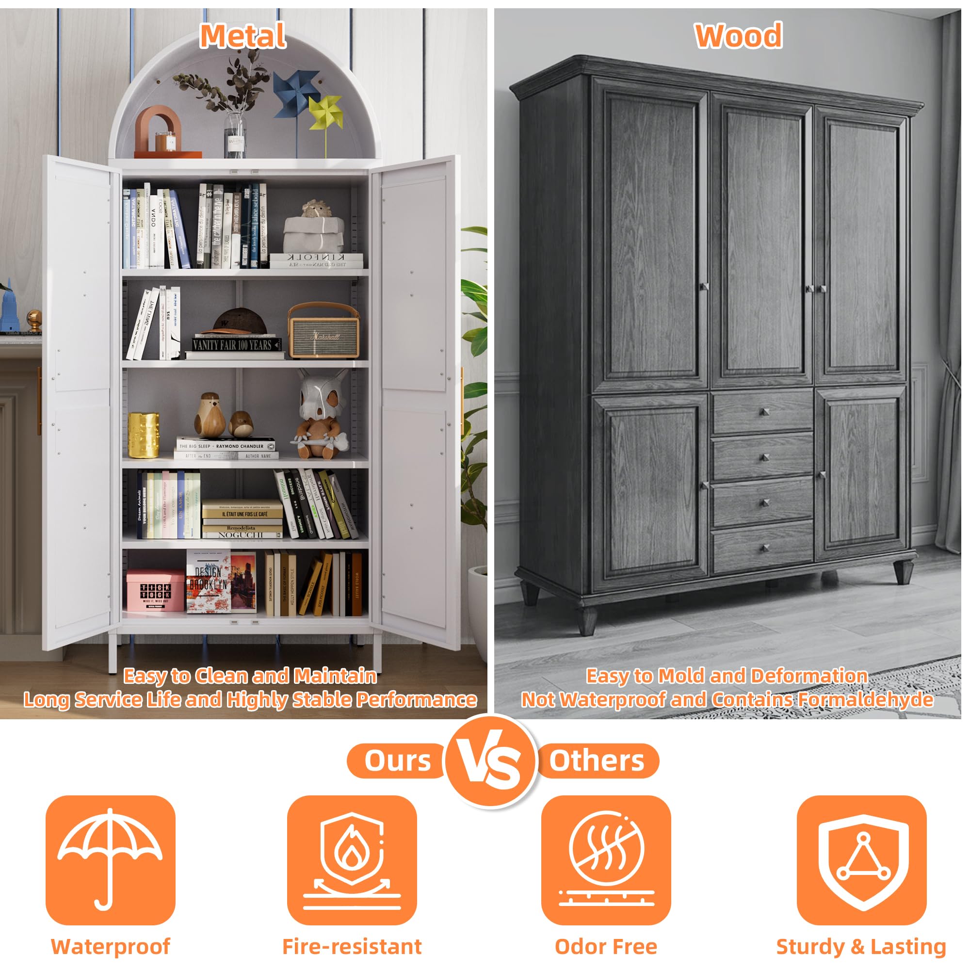 • High-quality Materials: Arched bookshelf is made of metal, which is sturdy and durable, not prone to corrosion or deformation, environmentally friendly and formaldehyde-free. The white arched cabinet is more green and environmentally friendly than wooden cabinets, creating a healthy and comfortable environment.