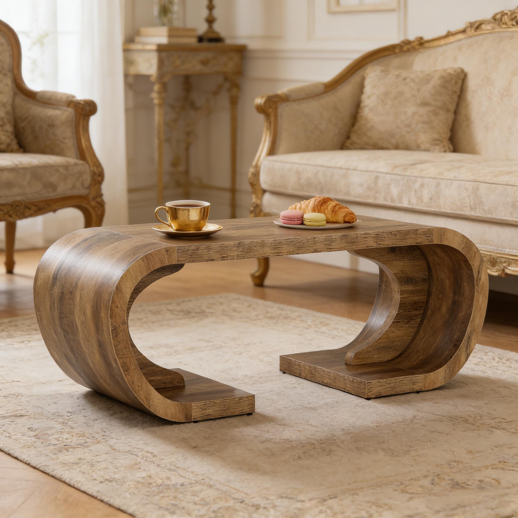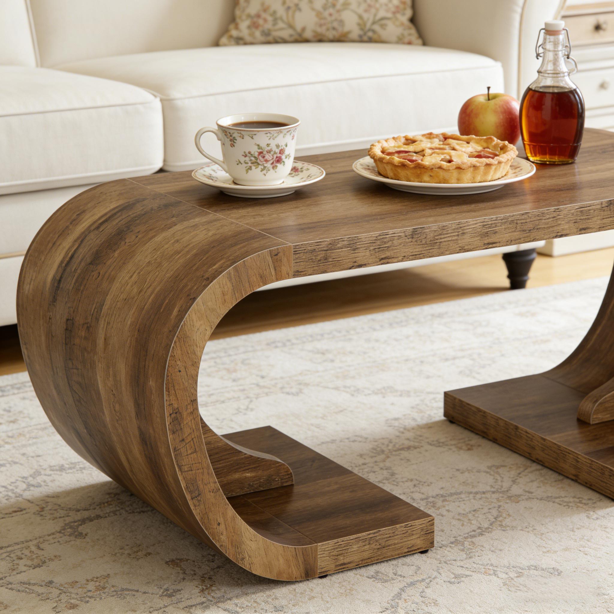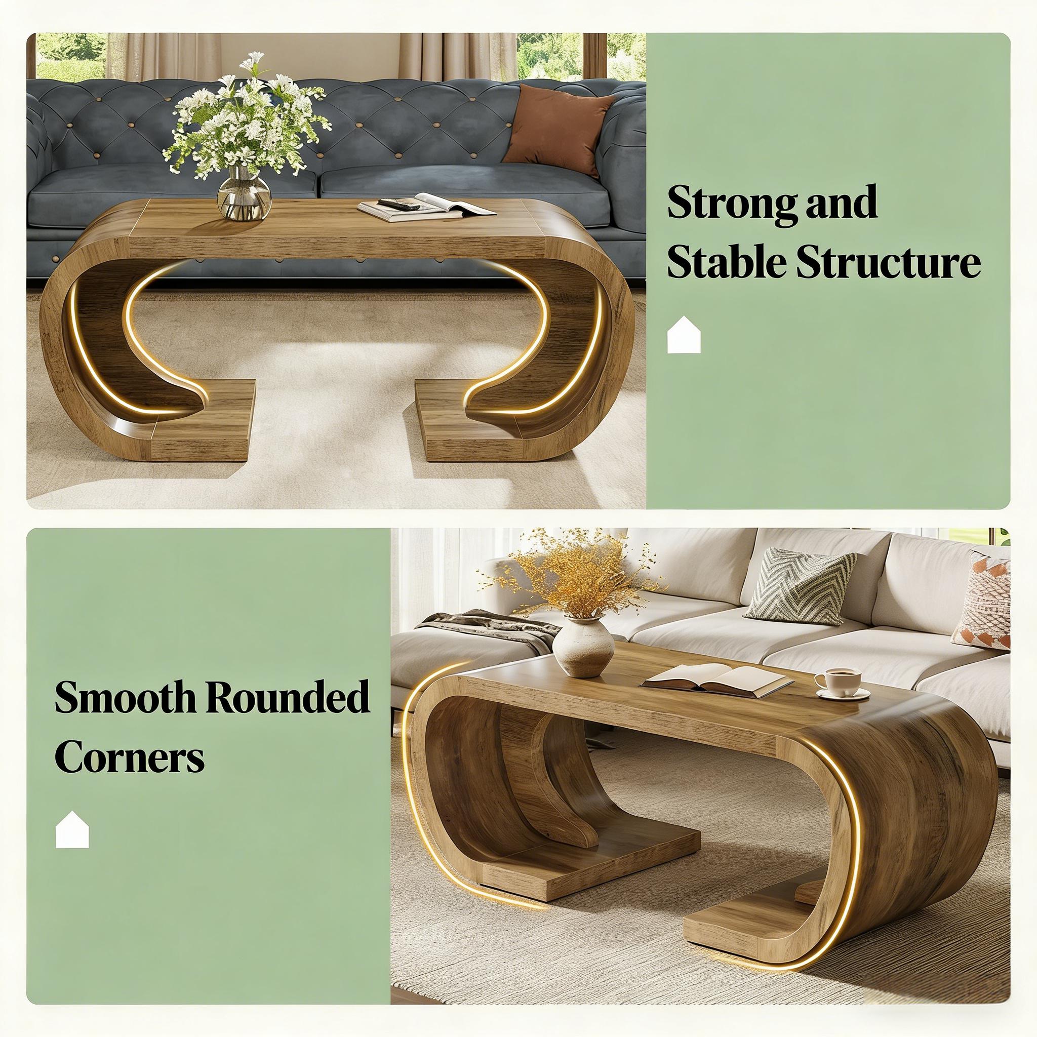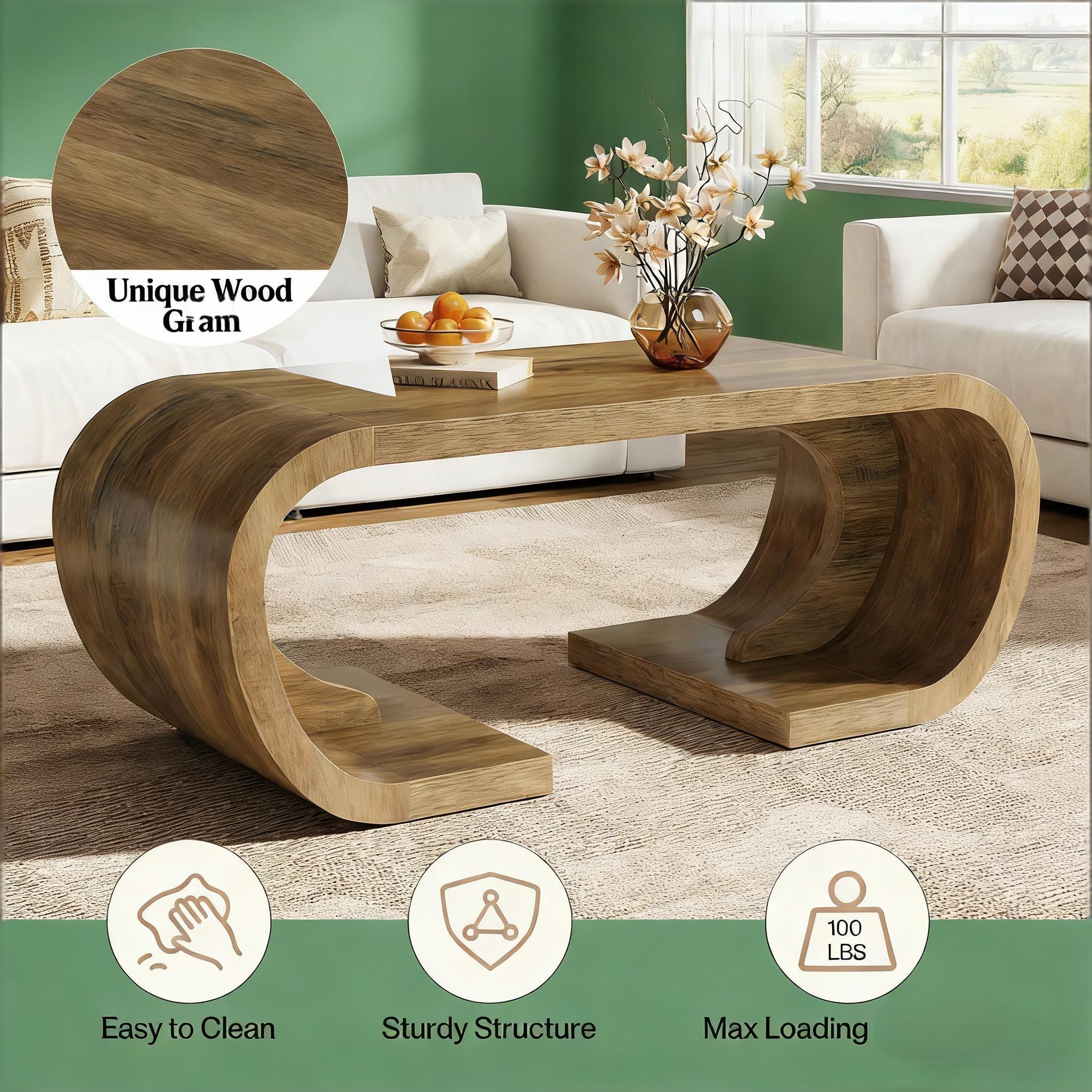 Important Reminder!!! 1) Attention: All products in our store do not support Canada self pickup ordering. Please do not create shipping labels for Canada. Our American products do not support self pickup to Canada 2)We do not ship to Alaska, Hawaii, US protectorates (e.g., Puerto Rico), P.O. boxes, or APO/FPO addresse 3)We don’t accept non-defective remorse returns Artistic & Curvy - Inspired by ocean waves, this artistic wooden coffee table endows your space with a distinctly curated touch. Its unique curved design steals the show like a museum piece, completing your stylish decor. Built to Last - This sturdy center table, crafted from 2" thick MDF with dual-arc support, can withstand up to 330 pounds. It additionally features a water-resistant finish for easy cleaning. Safe & Functional - With smooth, rounded edges, this large coffee table is a safe addition for homes with children or pets, perfectly merging style with function. Roomy & Balanced - This 47" long cocktail table, designed for everyday use, seamlessly blends visual weight with open curves, providing space underneath for storage baskets, or stretching out your legs. Easy Assembly - Our coffee table comes with a simple four-step assembly process, making setup quick and easy.