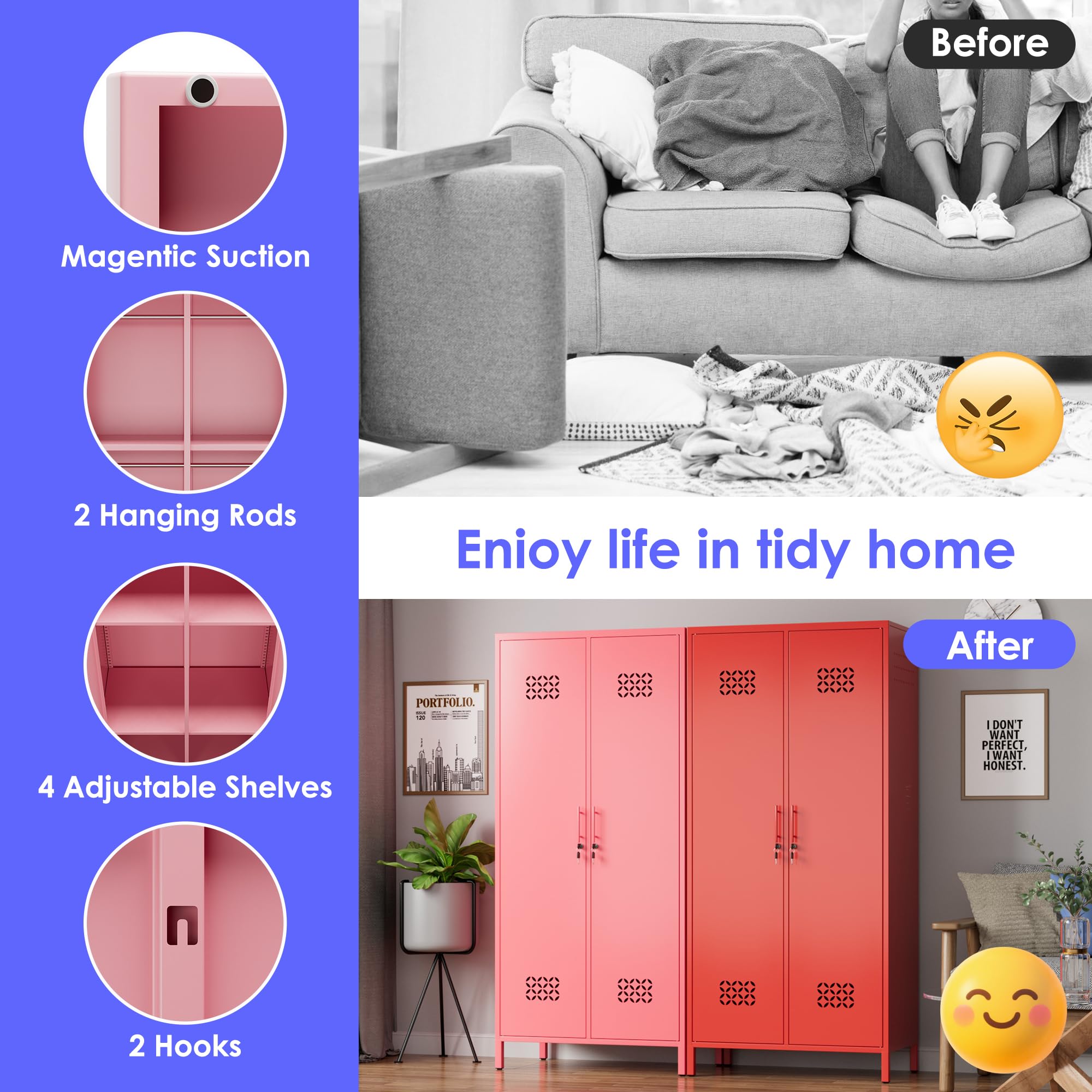 • 【Multifunctional-use】Metal wardrobe cabinet suitable for use in homes, offices, gyms, schools, locker rooms and dormitories. Easy to summarize all kinds of clothes and items.